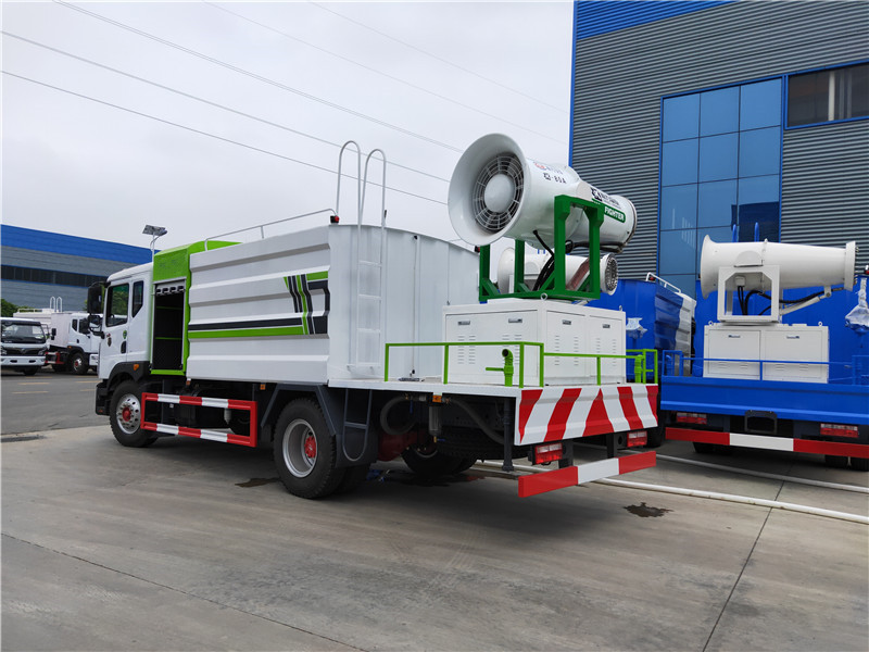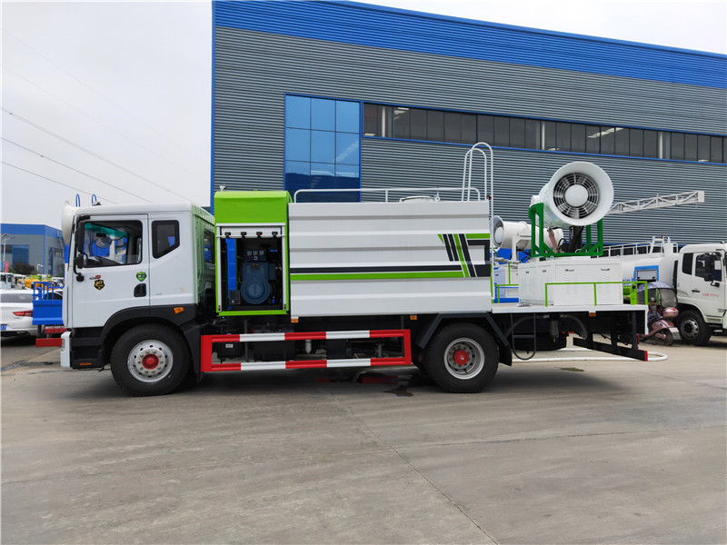 | 灑水車工作主要由發動機帶動變速箱,變速箱上安裝的取力器帶動灑水車水泵產生動力,將罐體內部的水通過管路噴灑出去,水泵可自吸自排。可根據用戶需求選配抑塵霧炮。 | |